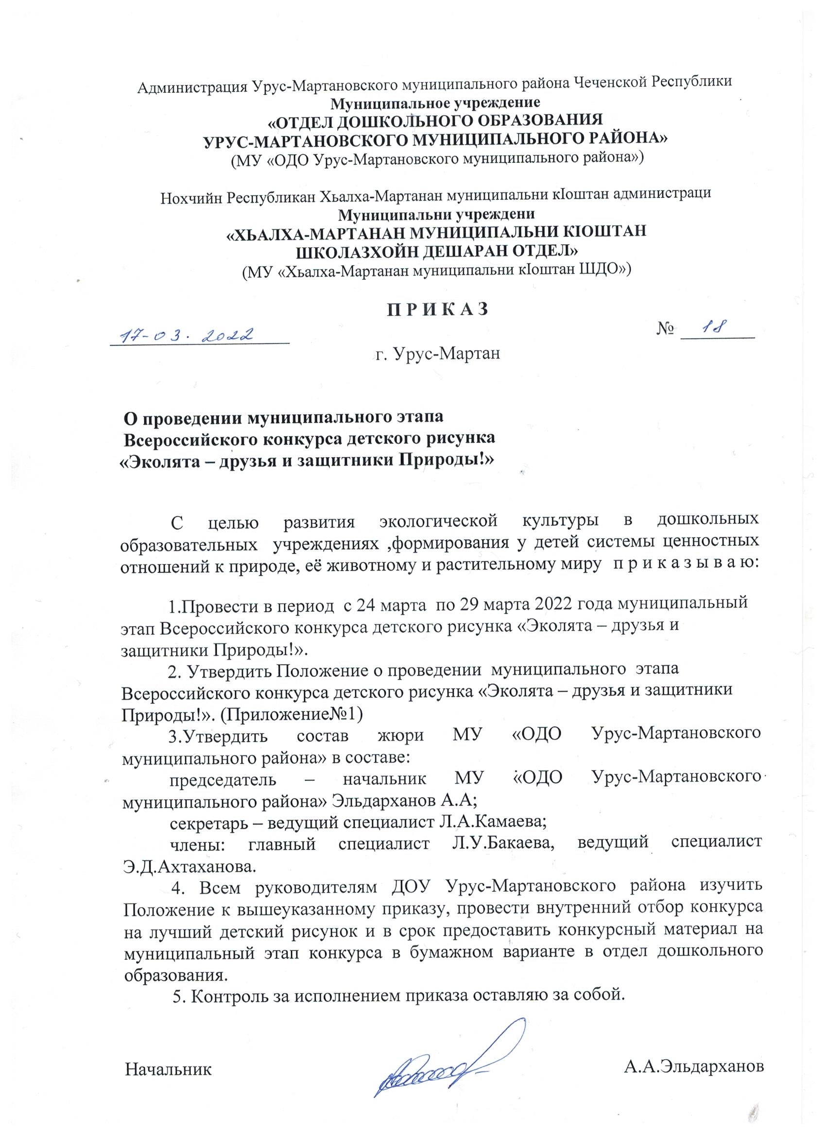 Приказ об утверждении Порядка предоставления учредителю отчета о результатах самообследования муниципальных бюджетных дошкольных образовательных учреждений Урус-Мартановского муниципального района