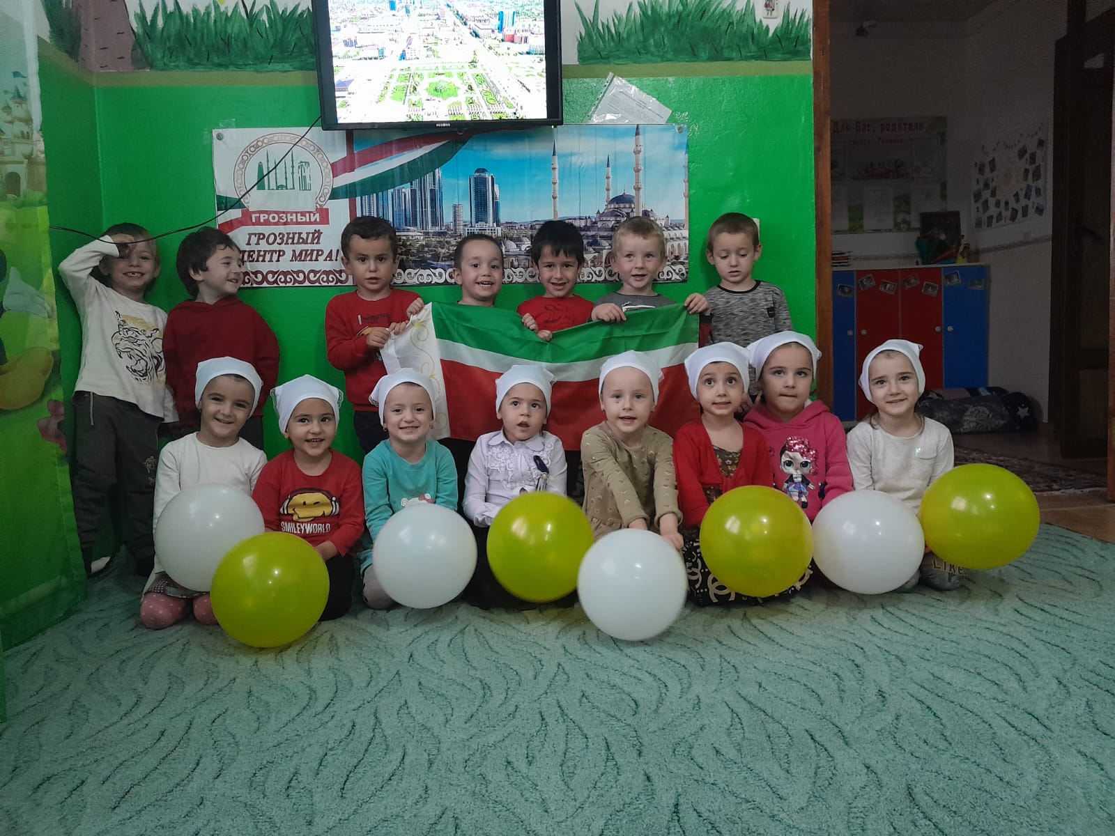 В группах были проведены тематические беседы, дети рассматривали иллюстрации и фотографии с изображениями г. Грозный. Воспитанники групп показали праздничную программу сотрудникам сада. Звучала музыка, дети читали стихи, пели песни и танцевали.