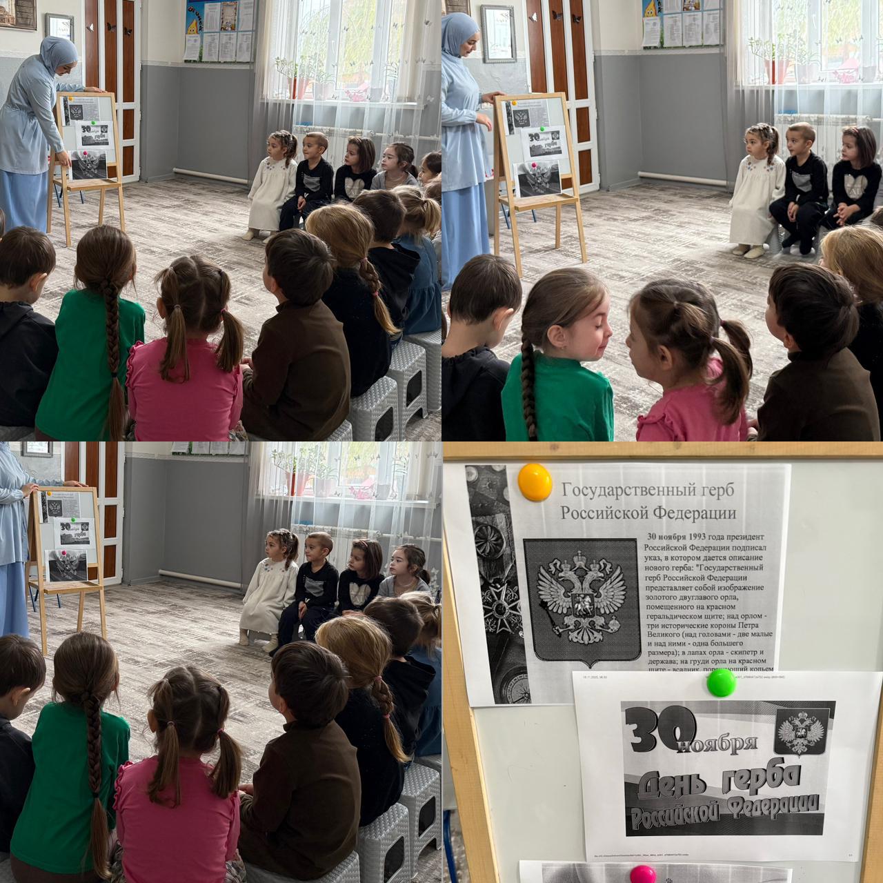 Согласно годовому плану МБДОУ «Детский сад № 2 «Огонек» с. Старые Атаги Урус-Мартановского муниципального района» на 2025-2026 учебный год, 28 ноября 2025 года в группах были проведены тематические беседы, посвященные ко Дню Государственного герба РФ.